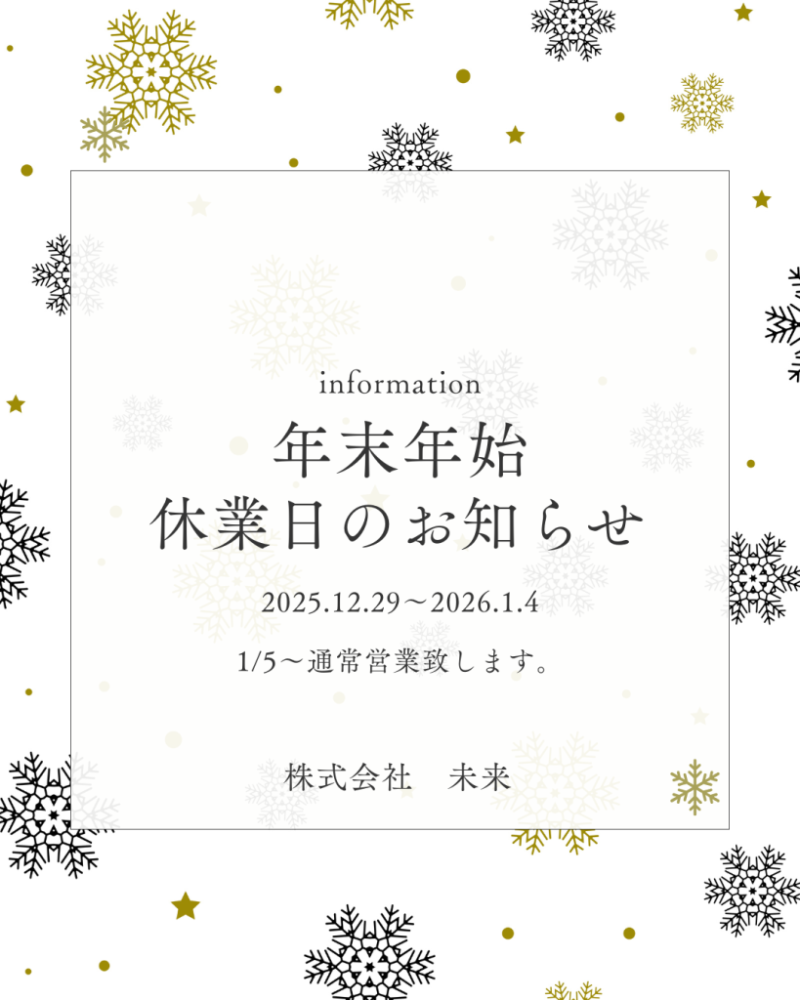 NEWS 2025.12.23 年末年始休暇のお知らせ* 今年もお世話になりありがとうございました。 年末年始の営業についてご案内いたします。 ◆2025年12月29日~2026年1月4日 1月5日より通常通り営業致します。 よろしくお願い致します。